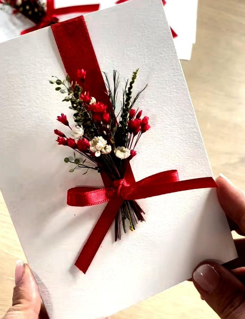 Um cartão feito com flores naturais desidratadas, cheio de charme.