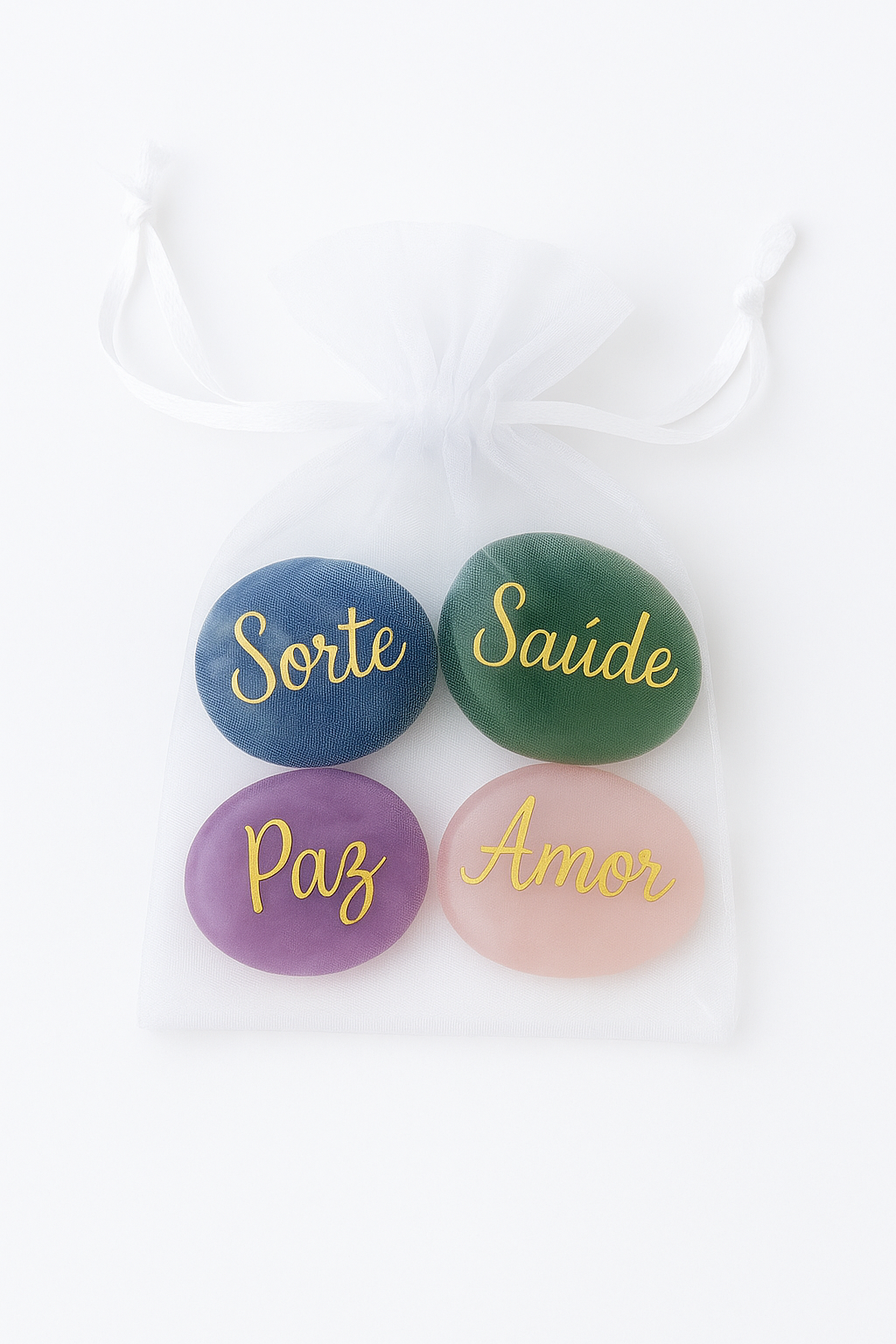 *As 4 pedras roladas (medida aproximada: 3 a 5 cm) são personalizadas com os nomes correspondentes de cada significado principal.