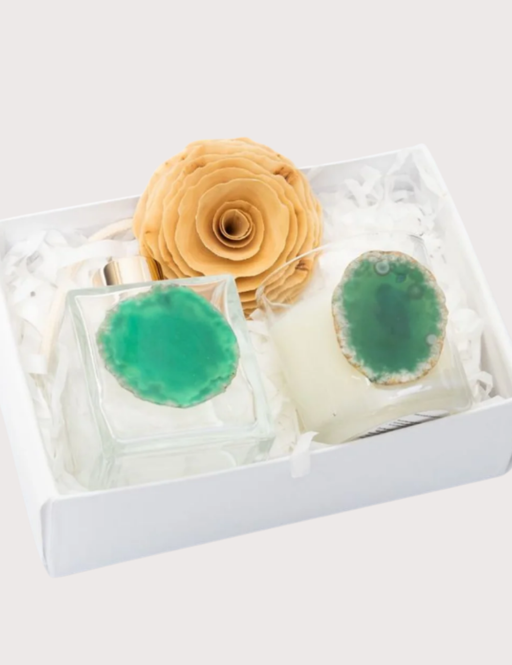 O Difusor com pedra Ágata purifica e energiza o espaço, enquanto a flor de madeira, além de perfumar, adiciona um charme natural. A vela com aplique ágata