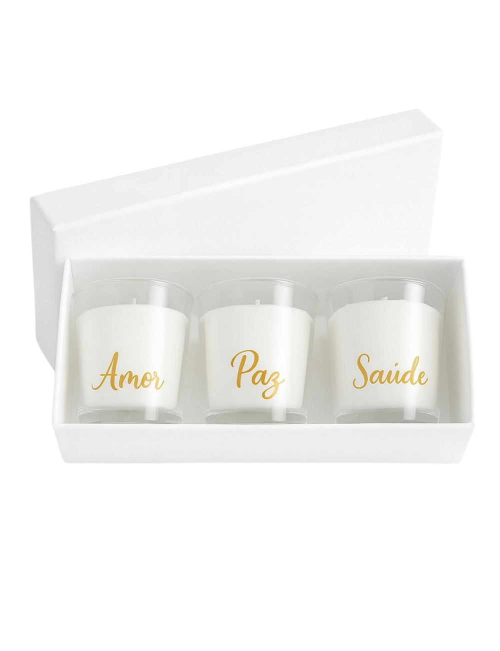 • 03 Mini Velas Aroma Chá Branco - 70gr personalizadas Amor, Paz e Saúde