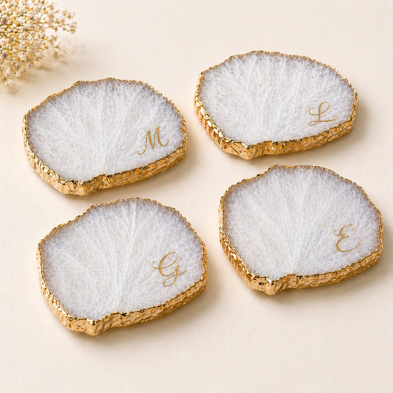 Porta-copos em Quartzo com borda em ouro: um toque sofisticado e cheio de significado para a sua mesa.