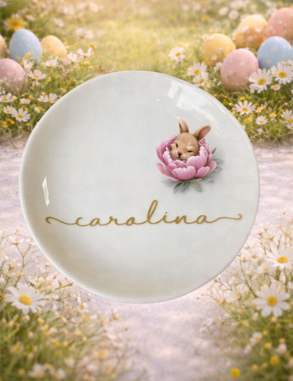 • 01 Porta-Joias Personalizado com Coelho da Páscoa e Nome -  Medida 11cm diam. x 3cm alt.